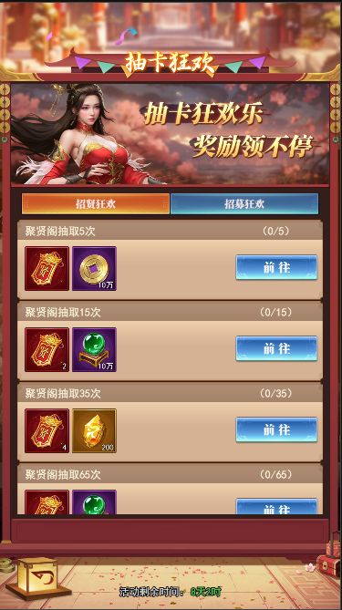 活动期间抽奖达到一定次数,可领取对应的招贤令、高级招募令等奖励