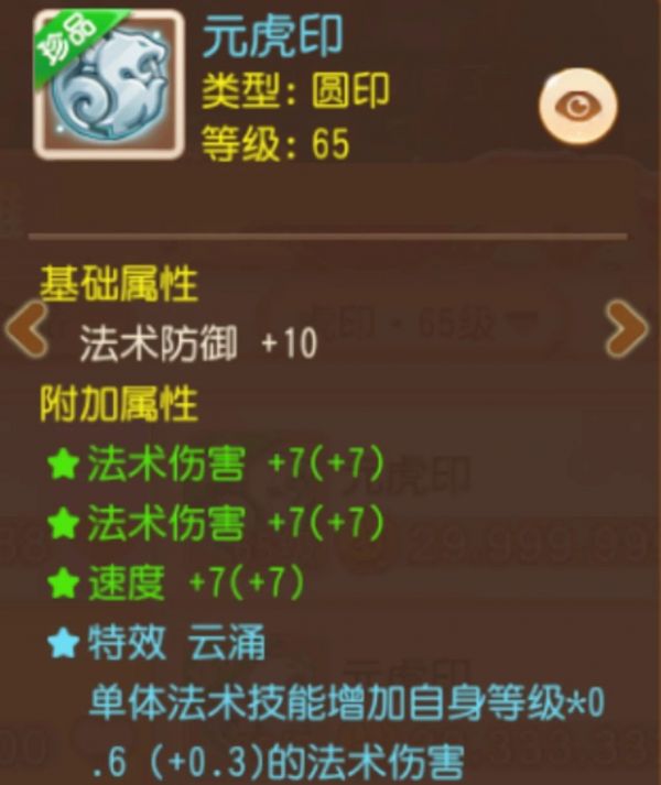 法术伤害、速度、单体法术伤害是须弥海的核心属性。这个虎印不仅拥有2条法术伤害、1条速度加成的附加属性,星盘特效还是能够增加单体法术伤害的云涌。如此特效加成,仿佛是为须弥海门派量身定制一般,很难让人不喜欢!