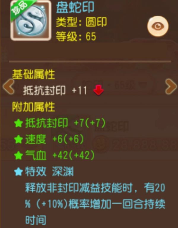 这个盘蛇印,主属性为抵抗封印,搭配上附加属性的抵抗封印、速度、气血词条,可谓是全方位开花,想必这就是精锐地府少侠追求的毕业星印吧~