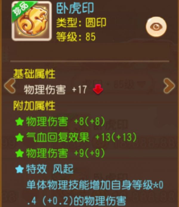 基础属性为物理伤害,附加属性也包含了2条物理伤害加成,可谓是锦上添花。不仅如此,特效风起更是将物理伤害提升至极致,满强化的风起特效能帮助勇武少侠在战斗中获得53.4点的单体物理技能伤害加成,这样的物伤虎印谁能不爱呢?