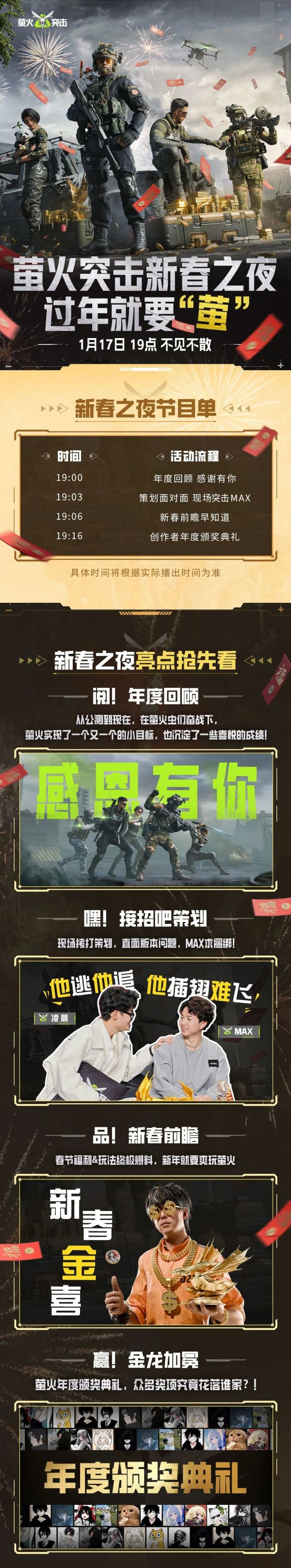 1月17日19点,相约直播间锁定萤火突击新春之夜,我们不见不散,一起狂欢共“萤”新年!