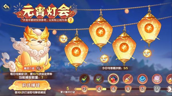 活动说明:元宵佳节,花灯如昼,西普大陆的元宵灯会开始啦,累计解开一定数量的灯谜还可以获得对应的奖励!元宵专属精灵也在大陆出没,每日可捕捉一次,答对一定数量的谜题后解锁捕捉。