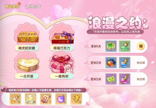 ①浪漫之约:情人节签到活动,每签到3天还可选择一份情人节礼物。