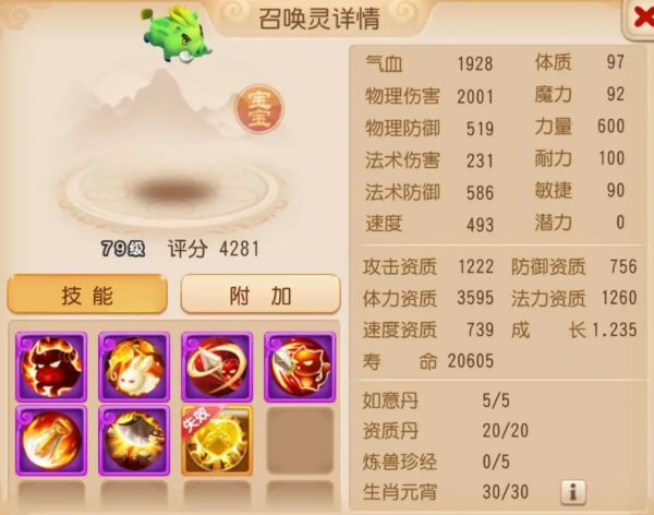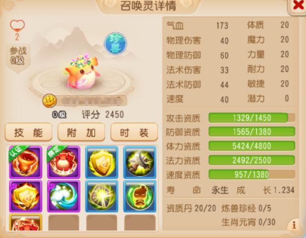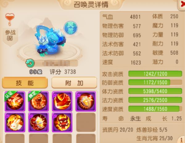 水灵兽自带减伤和冰冻机制,如果再搭配上法防、嘲讽等特殊技能,将会成为团队最为强劲的保障。在资质属性上,这只双特殊水灵兽攻击资质、体力资质、法力资质均已爆满,搭配上1.25的高成长,这样一只水灵兽简直是三界不可多得的极品!