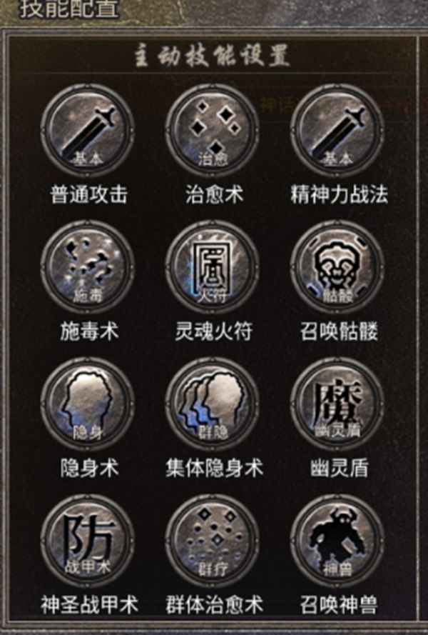 道士主动技能有十一式,分别是治愈术、精神力战法、施毒术、灵魂火符、召唤骷髅、隐身术、集体隐身术、幽灵盾、神圣战甲术、群体治愈术、召唤神兽。召唤神兽踏破幽冥,施毒术蚀透九幽,灵魂火符洞穿阴阳。