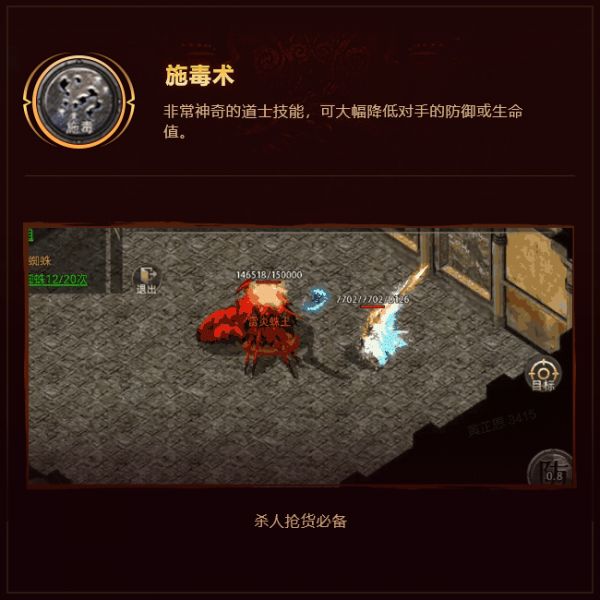 ②施毒术,非常神奇的道士技能,可大幅降低对手的防御或生命值。道士是战场上的好搭档,也是令人恐怖的暗杀者,杀人抢货必备。