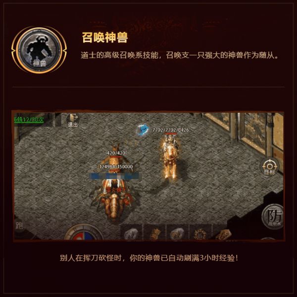 ③召唤神兽,道士的高级召唤系技能,召唤支一只强大的神兽作为随从,别人在挥刀砍怪时,你的神兽已自动刷满3小时经验!