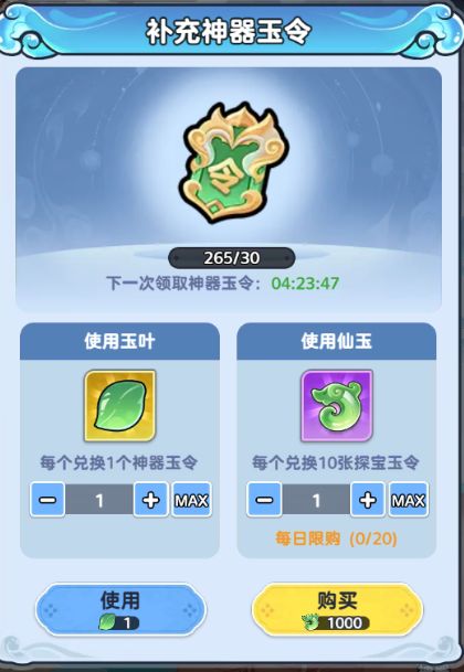 2. 玉叶、仙玉兑换走起:除了等气泡,还能用玉叶或者仙玉来兑换探宝玉令。用仙玉购买的话,每天能买 20 次。玉叶可以在不定时开启的各种有趣活动里拿到,像限时挑战、趣味竞赛之类的,大家一定要积极参加这些活动,这样就能有更多玉叶去换玉令啦!