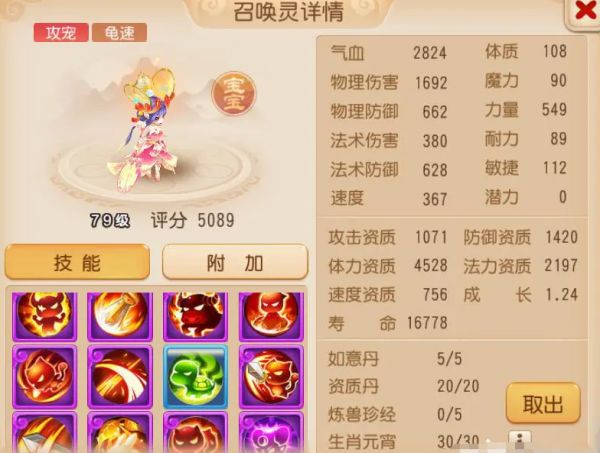首先,让我们来看看这只11技能龟速攻宠蚌仙子!成长高达1.24,攻击资质1071,速度面板367,物理伤害面板高达1692!在敌方单位被击倒后,蚌仙子龟速出手可以成功完成守尸任务。这只蚌仙子辅助书选择了高级强力、高级突进、高级协力、高级跃进,这么一只与众不同的龟速攻宠出场,对方一定意想不到!