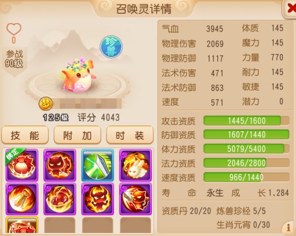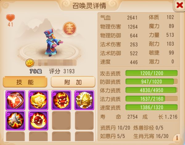 说到神威组别稀有召唤灵嘲风,其套装及专属内丹效果都有着不俗的恢复站场能力。这只9技能嘲风成长1.265,攻击资质1499,体力资质4760,技能选择了高级协力、高级招架、高级吸血,对比日常的配速嘲风,它不仅特别能扛还特别能打!