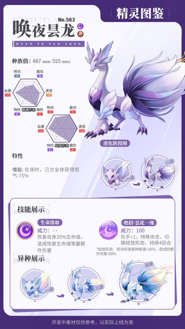 更为神秘、阴郁的唤夜昙龙,常年镇守在堕龙渊,传说它尾端花朵绽放时景象震撼,但却转瞬即逝,并会迸发巨大能量。不过在进化过程中,被邪龙神的力量感染,使它获得了汲取周围生机的能力。如今它虽然能更快积蓄花开的力量,绽放得更加频繁,但也令周遭草木凋零,生灵枯萎。