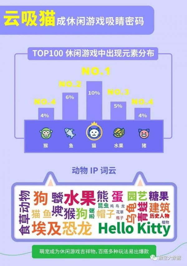 Top 100休闲游戏中,出现元素最多的是“猫”,占比10%。鱼、水果、猴、猪紧随其后。