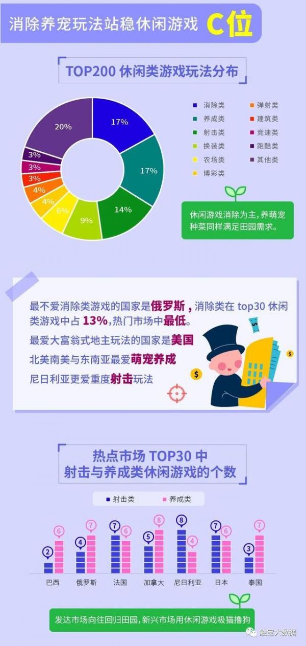 休闲类游戏玩法分布图中,Top 200有多达20%的消除类游戏,占比最多。而对于这个热门玩法类别,俄罗斯显然是最不感冒的一个国家,消除类在其Top 30休闲游戏中仅占13%。