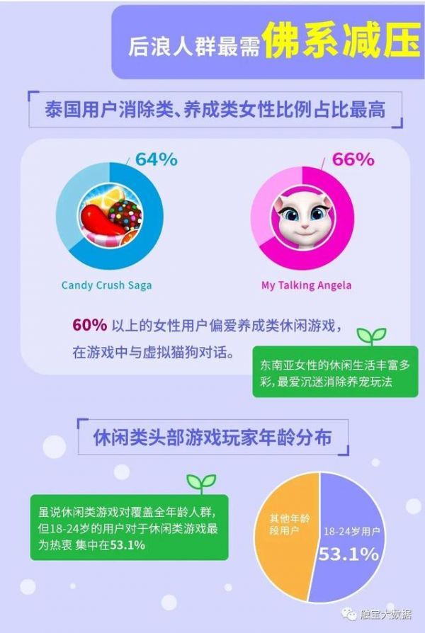 东南亚女性的休闲生活更为丰富,最沉迷消除养宠玩法。其中泰国用户消除类、养成类女性比例占比最高,60%以上的女性用户愿意加入到养成游戏中,和虚拟猫狗对话。