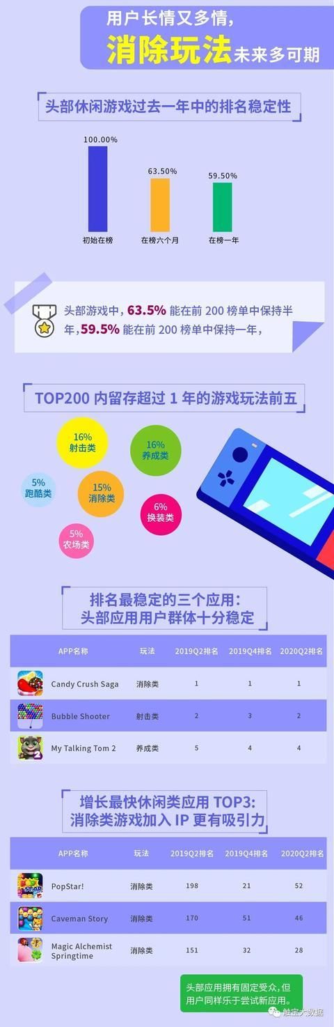 头部游戏中,63.5%能在Top 200榜单中保持半年,59.5%能在Top 200中保持一年。在榜单留存超过一年的游戏中,主要玩法包括射击类、养成类、消除类、换装类、跑酷类和农场类。