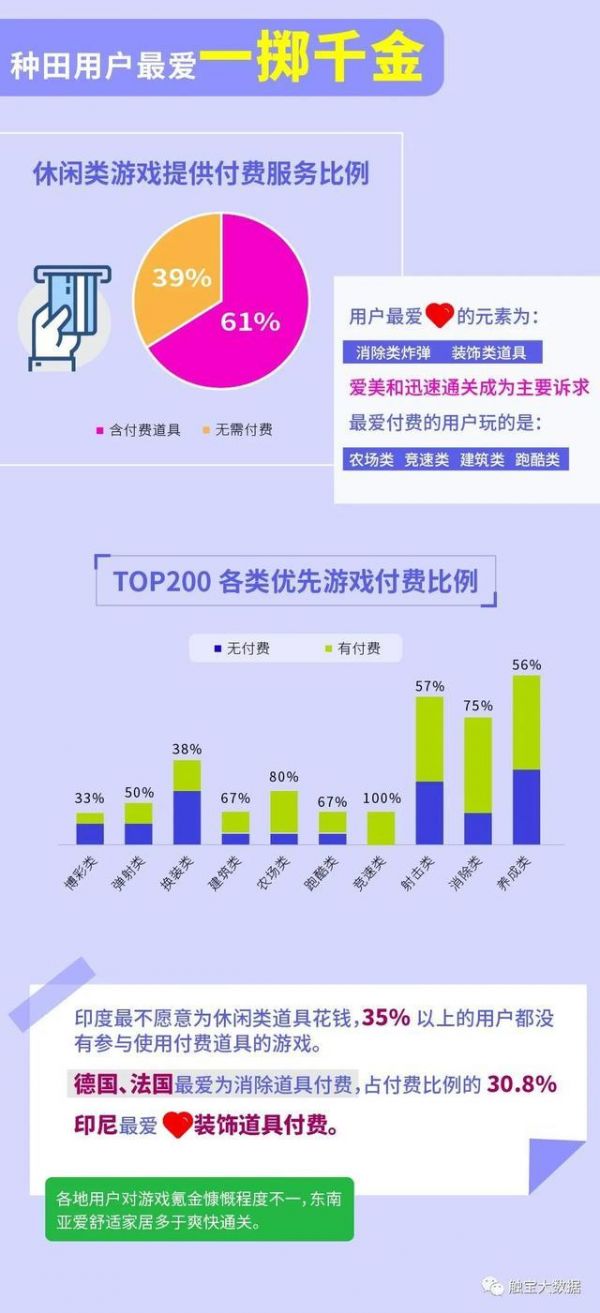 另外,印度玩家最不愿意为休闲游戏道具付费,35%以上的用户没有参与使用付费道具的游戏。相对应的,德国、法国最爱为消除游戏付费,占付费比例的30.8%。