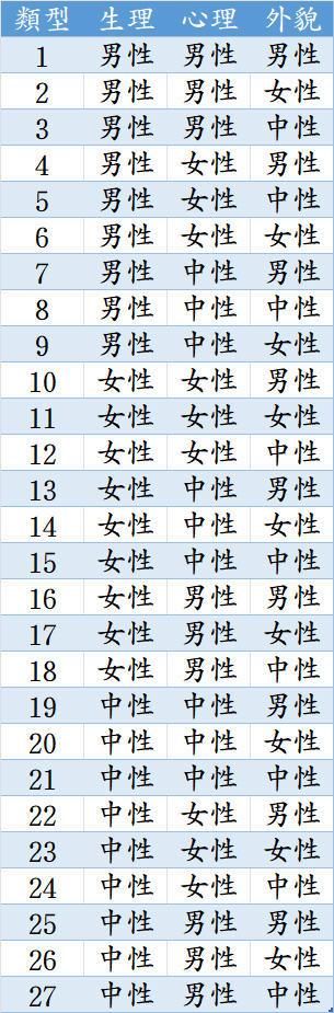 在编剧领域,性别有3个主要维度:生理、心理、外貌,状态也至少有3种:男性、女性、中性。维度的状态可以统一,也可以不统一。根据这个标准,我们可以得到27种性别组合。