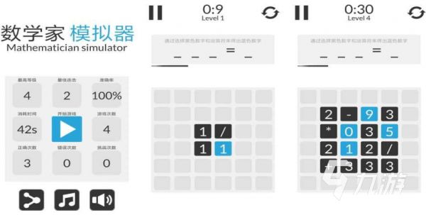 《数学家模拟器》是一款几多种数学运算为一体的益智小游戏。游戏的整体画面特别的简洁,由黑白蓝色色调组成。这里有特别多的关卡,每个关卡的难度等级是递增的,在你的闯关过程中会有时间计时。你将根据屏幕中提供的黑色方块数字去计算出正确的结果,填入到蓝色方块里面。每一个关卡结束后,界面都会显示出你挑战关卡的准确率和耗费时间,能给你做一个有效的总结。