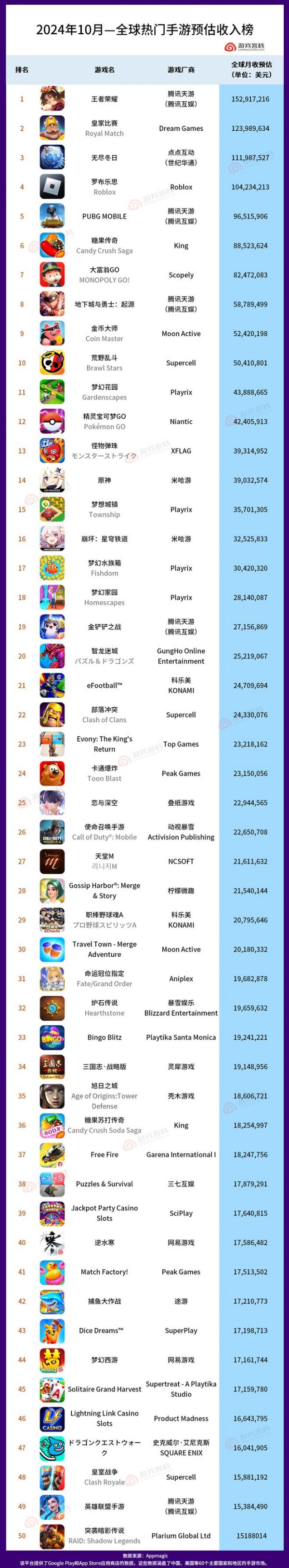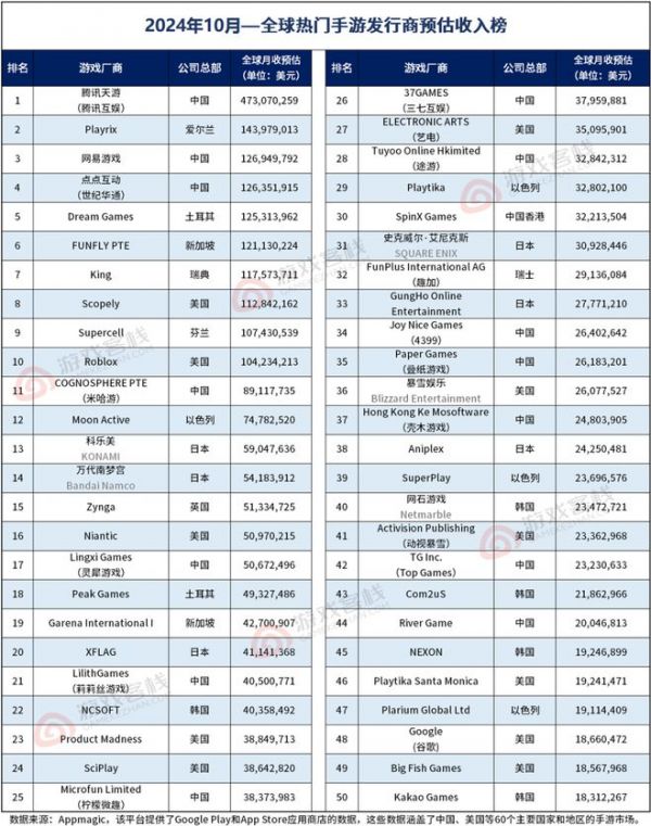 机构:10月全球手游发行商收入榜公布,腾讯等34个中国厂商入围