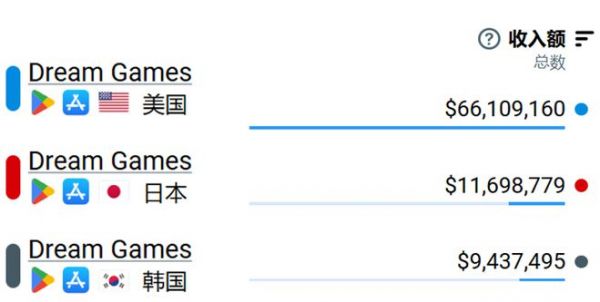 在观察期内,总部位于土耳其的游戏厂商Dream Games全球月收预估达到了1.25亿美元(折合人民币约为9.06亿元),进入榜单TOP5。Dream Games的全球月收预估中,美国市场预估收入表现最佳,占比近52%;其次是日本市场,占比9%;韩国市场占比7%。