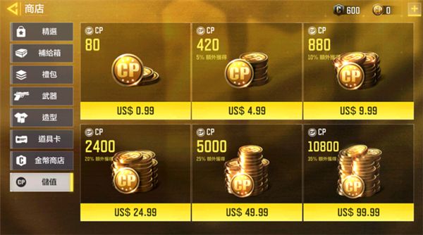 跟所有的游戏一样,《使命召唤手游》中拥有两种不同的货币,分别为金币与CP点数。顾名思义,金币就是游戏中完成比赛后获得的游戏内货币,CP点数当然就是玩家通过充值才能够获得氪金点数。