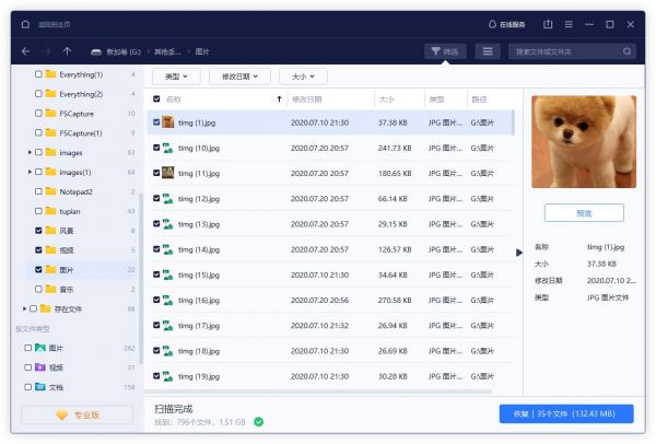 扫描开始。一段时间(快速扫描结束后),您会发现「删除文件」分类下已经列举出软件所能找到的所有被删除文件。当然,在扫描中途,一旦发现想要还原的文件已经被软件扫描找到,也可以在未完成扫描过程的情况下进行恢复。