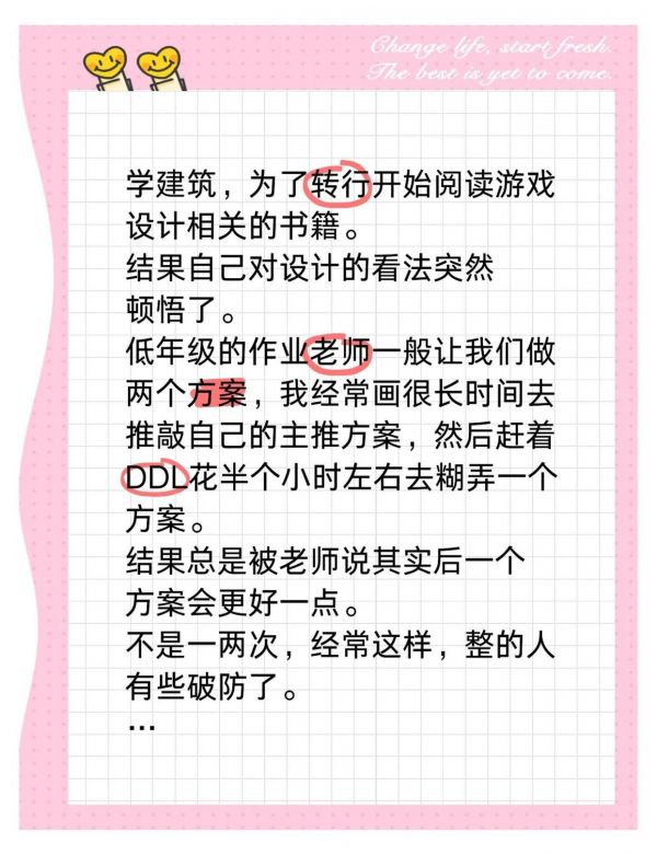 当我开始阅读游戏设计相关的书籍时,我对设计的理解突然有了质的飞跃。在低年级时,老师通常会要求我们做两个设计方案。我常常会花费大量时间来完善我的主推方案,然后在截止日期前草草地完成第二个方案。结果总是被老师指出,第二个方案可能更好。