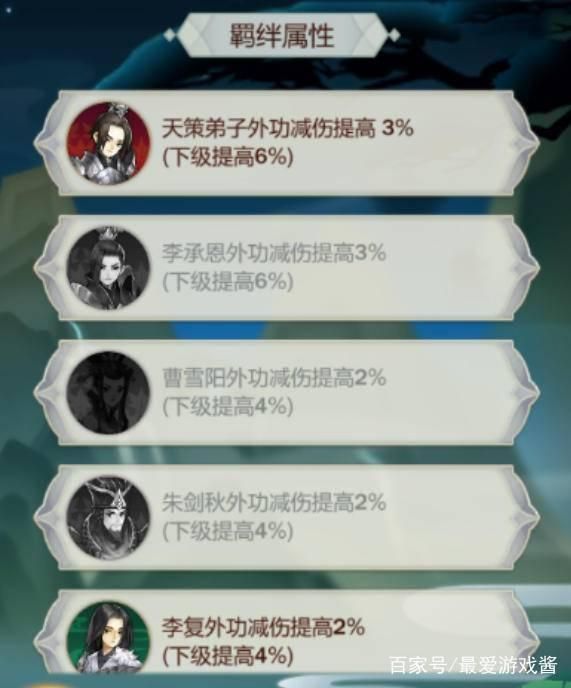 选择相应的羁绊技能之后,属性也会有所提升,比如外功减伤提高,随着羁绊属性升级,减伤效果会更高,被敌人围殴致死的概率,也大幅降低。
