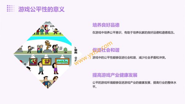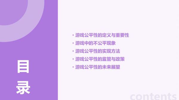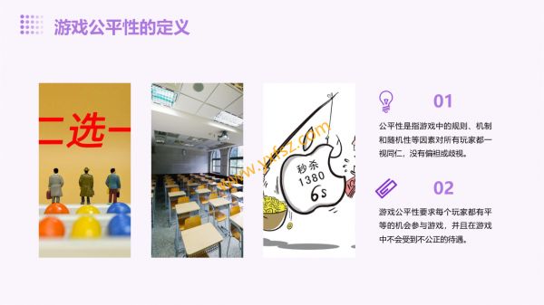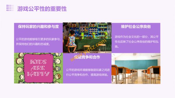 官聘小学北师四下游戏公平课件•游戏公平性的定义与重要性•游戏中的不公平现象•游戏公平性的实现方法•游戏公平性的监管与政策目•游戏公平性的未来展望录contents01游戏公平性的定义与重要性游戏公平性的定义01公平性是指游戏中的规则、机制和随机性等因素对所有玩家都一视同仁,没有偏袒或歧视02游戏公平性要求每个玩家都有平等的机会参与游戏,并且在游戏中不会受到不公正的待遇游戏公平性的重要性保持玩家的兴趣和参与度维护社会公序良俗游戏作为社会文化的一部分,其公平公平的游戏能够吸引更多的玩家参与,性也反映了社会公序良俗的维护和弘并保持他们的兴趣和忠诚度扬促进竞争和合作公平的游戏环境能够鼓励玩家之间进行公平竞争和合作,提高游戏体验游戏公平性的意义培养良好品德在游戏中培养公平意识,有助于培养玩家的良好品德和道德观念促进社会和谐游戏中的公平性能够促进社会和谐,减少社会矛盾和冲突提高游戏产业健康发展公平的游戏环境能够促进游戏产业的健康发展,提高行业的整体水平02游戏中的不公平现象等级差异等级差异可能导致某些玩家在游戏中处于不利地位,例如高等级玩家可能拥有更多的技能和属性,导致低等级玩家难以与之竞争等级差异可能导致游戏中的不公平现象,例如某些任务或副本可能只适合高等级玩家,低等级玩家可能无法参与道具收费一些游戏可能会通过收费来提供更好的道具或装备,这可能导致付费玩家与非付费玩家之间的不公平竞争道具收费可能会破坏游戏的平衡性,导致一些玩家通过付费获得不公平的优势技能与属性的不均衡在一些游戏中,不同的角色或职业可能拥有不同的技能和属性,这可能导致某些角色或职业在游戏中具有优势技能与属性的不均衡可能导致游戏中的不公平现象,例如某些技能可能过于强大或某些属性可能过于弱势匹配机制问题一些游戏的匹配机制可能存在问题,例如将高水平的玩家与低水平的玩家匹配在一起,这可能导致低水平玩家在游戏中处于不利地位匹配机制问题可能导致游戏中的不公平现象,例如在竞技场或比赛中,不合适的匹配可能导致比赛结果的不公平03游戏公平性的实现方法平衡性设计英雄/角色平衡物品/装备平衡游戏规则平衡确保游戏中的英雄或角色在能力、合理设置游戏中的物品和装备,制定公平的游戏规则,确保玩家技能和属性上没有明显的优劣之确保玩家可以通过不同的策略和在游戏中受到相同的限制和机会,分,避免出现某些英雄在游戏中选择获得所需的物品和装备,避避免出现某些玩家利用规则漏洞过于强势或弱势的情况免出现某些物品或装备过于强大获得不公平的优势或无用的情况反作弊机制更新与维护定期更新和升级反作弊系统,以应检测与惩罚对新的作弊手段和技术的出现,确保系统的有效性建立有效的反作弊机制,通过技术手段检测和识别作弊行为,并对作弊玩家进行相应的惩罚,如警告、封号等举报与反馈建立玩家举报和反馈渠道,鼓励玩家积极举报作弊行为,并对举报进行及时处理和回应透明收费模式明确定价游戏应明确定价策略,包括收费项目、收费标准、1收费方式等,避免出现隐形消费或欺诈行为公平交易提供公平的交易环境,确保玩家在购买虚拟物品2或服务时得到合理的价值,避免出现价格虚高或欺诈的情况透明账单提供透明的消费账单,让玩家清楚了解自己的消3费记录和花费情况,增加玩家的信任度玩家参与决策010203玩家反馈社区参与投票与决策积极收集和听取玩家的反鼓励玩家参与游戏社区的通过投票等方式让玩家参馈和建议,对游戏进行持建设和管理,让玩家有更与游戏的重大决策,增加续改进和优化,提高玩家多的机会参与到游戏的决玩家的归属感和参与感的满意度策和改进中来04游戏公平性的监管与政策游戏公平性的法律法规禁止赌博限制时间禁止不良内容禁止任何形式的赌博行为,限制未成年人游戏时间,禁止游戏内出现暴力、色包括虚拟货币、游戏道具防止过度沉迷情等不良内容等游戏平台的监管责任实名认证要求玩家进行实名认证,确保玩家身份的真实性限制消费限制未成年人的消费行为,防止过度消费举报机制建立完善的举报机制,及时处理玩家投诉玩家权益保护隐私保护01保护玩家个人信息不被泄露赔偿机制02建立赔偿机制,对玩家的损失进行赔偿投诉处理03及时处理玩家投诉,维护玩家权益05游戏公平性的未来展望技术进步对游戏公平性的影响人工智能技术通过AI算法,实现更加精准、智能的匹配机制,减少作弊和不平衡现象区块链技术利用区块链的不可篡改特性,确保游戏数据和结果的公正性,提高玩家信任度虚拟现实技术通过虚拟现实技术,为玩家提供更加沉浸式的游戏体验,降低由于设备差异带来的不公平性玩家对游戏公平性的期望与需求公平竞技环境玩家期望在游戏中能够与同等水平的对手竞技,避免由于作弊或其他不公平手段导致的优势或劣势透明规则与机制玩家希望游戏规则和机制能够公开透明,以便了解自己在游戏中的地位和机会举报与申诉机制玩家期望游戏平台能够提供有效的举报和申诉机制,以便在遇到不公平情况时能够得到及时处理和回应游戏行业对公平性的重视与投入政策法规监管游戏行业将面临更加严格的政策法规监管,以确保游戏的公平性和道
