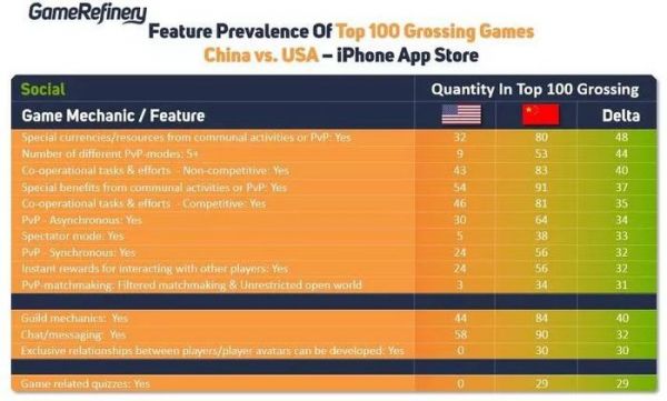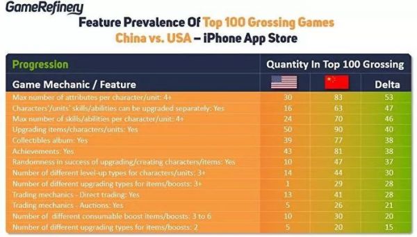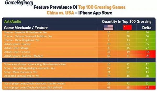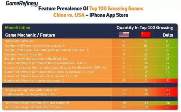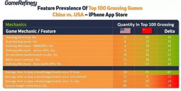 近日,海外数据分析公司GameRefinery发布了一份分析报告。报告选取中美两国App Store Top100的游戏为样本,对中西方移动游戏及游戏市场的异同点进行了分析。