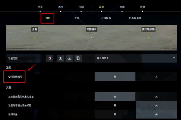 在【通用】选项栏中,你可以启用【使用高级选项】功能。启用后,你将能够分别针对【主要】、【开镜瞄准】以及【狙击瞄准镜】进行准星自定义。有些专业玩家倾向于将开镜瞄准设置为一个单一的点,以利于在远距离战斗中更精准地对枪。你可以根据自己的游戏风格和喜好,灵活地调整和DIY这些设置。