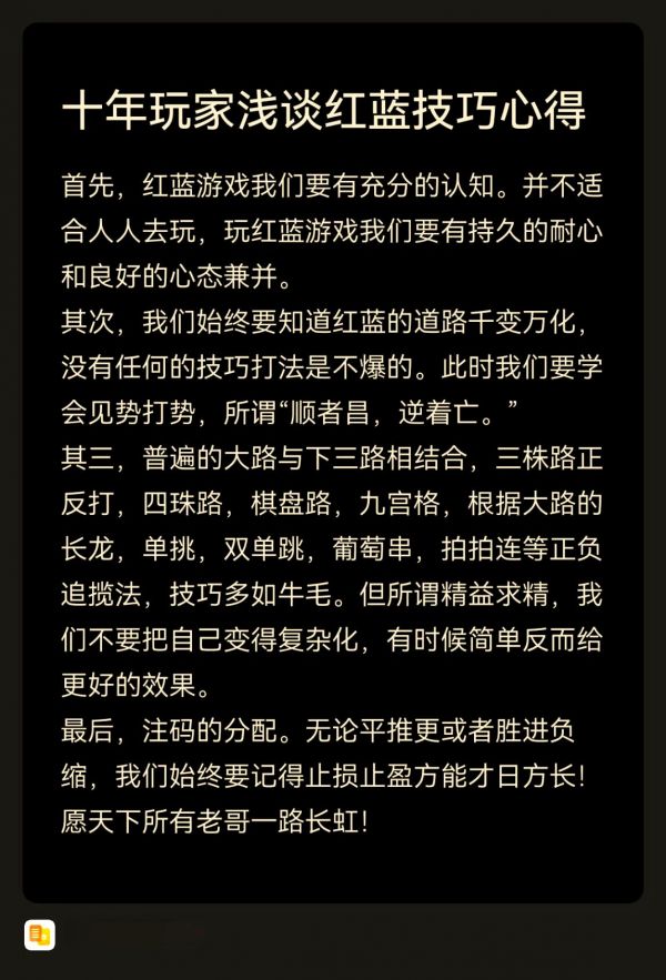 首先,玩红蓝游戏需要充分的认知。并不是每个人都适合玩这个游戏,需要持久的耐心和良好的心态。其次,红蓝游戏的道路千变万化,没有任何一种技巧或打法是绝对不会爆的。因此,我们需要根据形势变化灵活应对,所谓“顺者昌,逆者亡”。