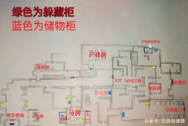1.记住地图:首先看下下面的地图,其中绿色标记为躲藏柜,蓝色标记为储物柜,其余房间为红字标记;