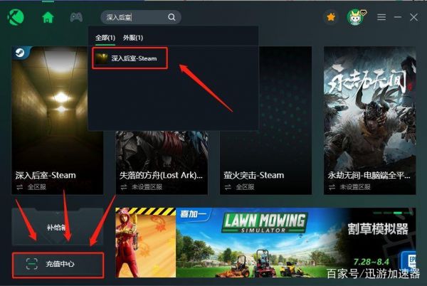 打开迅游加速 器搜索深入后室并选择深入后室-Steam进行加速,没有加速时长的小伙伴也不用担心,左下角【充值中心】进入后点击右下角【兑换码】输入白嫖迅游加速可得5天加速时长,新玩家还有3天免费时长,新玩家就能够一共获得8天的加速时长,兑换了之后并进行加速就能够顺利进入游戏畅快游玩啦!