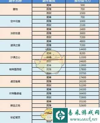 各副本推荐战斗力详情如下: