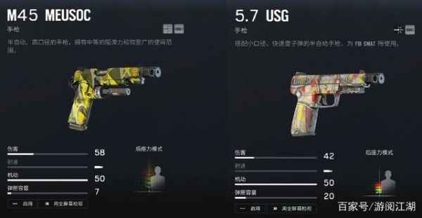 THERMITE的两把副武器分别是M45 MEUSOC 和5.7USB,这两把手枪的选择上可以说是见仁见智了。前者拥有高伤害的优势而后者拥有超大的弹夹容量和稳定性的优势。本人还是推荐各位携带5.7USB,首先20发的容量实在是太诱人了,这意味着你可以在危急时刻完全不需要担心换弹的问题,更何况在彩六这个靠着玄学爆头才能生存的游戏中,说不定多挥霍几发子弹就能够爆头了呢?