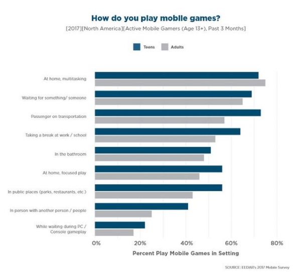 另外从青少年玩游戏的方式和场合来看,我们也能看出他们更具社交倾向的体验方式:在交通工具(比如校车)上、学校里和其他公告场合等,我们会看到更多的青少年玩家,另外他们也更喜欢和其他玩家聚在一起玩游戏。