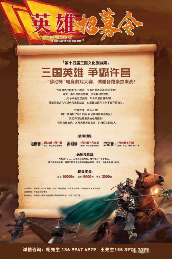 本报许昌讯( 河南法制报记者 贾鹏虎)“心无旁骛抓发展、全力以赴拼经济”,是许昌市委经济工作会议为新的一年谋定的蓝图。为持续推动文化和旅游消费的发展进步,3月22日至5月1日,第十四届三国文化旅游周期间,许昌市文化市场综合行政执法支队在许昌市文化广电和旅游局的组织领导下推出“三国英雄 争霸许昌”——“移动杯”电竞游戏大赛。三国故地一场“百家网吧、百支战队、百个站位”的大幕拉开。