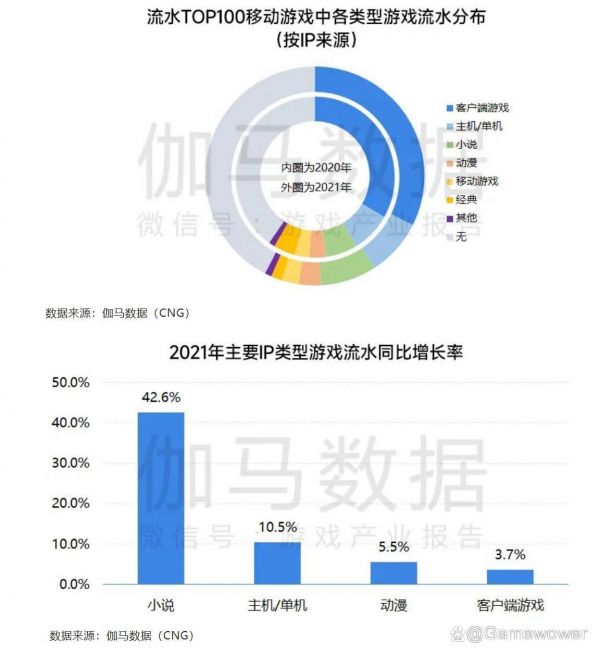 而根据伽马数据4月发布的《2021-2022移动游戏IP市场发展报告》显示,2021年IP改编移动游戏收入占移动游戏市场五成以上,但增长率不足5%。从IP类型来看,小说IP连续三年增长超40%,近年来多个小说IP得到影视化、动漫化与游戏化,多端共同作用放大了小说IP的商业价值,但国内IP改编的创收主流依旧是端游IP。2021年流水TOP100产品中,超八成IP运营时间在10年以上,同时这些IP提供了75.6%的产品流水。