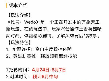 这个手游起源应该是王者荣耀本身想要附带的一个娱乐游戏“代号wedo”,类似吃鸡火了,王者出了“边境突围”,自走棋火了,王者荣耀就出了“王者模拟棋”,都是为了预防对应的目标玩家流失,当时dnf手游也是非常强势,王者荣耀就出了一个万象天工“代号wedo”的格斗游戏测试招募。
