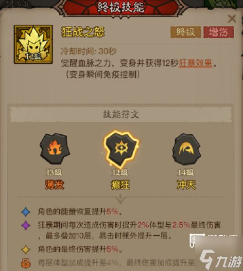 终极技能上面选择狂战之怒,可以获得狂暴效果(体形增大、暴击以及爆伤增加、减伤增加)!符文选择癫狂,增加最终伤害以增加火锤的最终爆发能力!