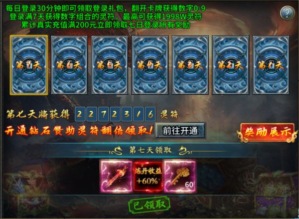 若累计真实充值满 200 元,无需耐心等待七天,立即领取活动所有奖励!奖励包含炫酷武器、实用道具、大量充值卡(20 元、50 元、100 元等)、海量金币(100 万等),还有炼丹收益加成道具、钥匙(40、50、60)等,助力你快速成长,称霸大陆!
