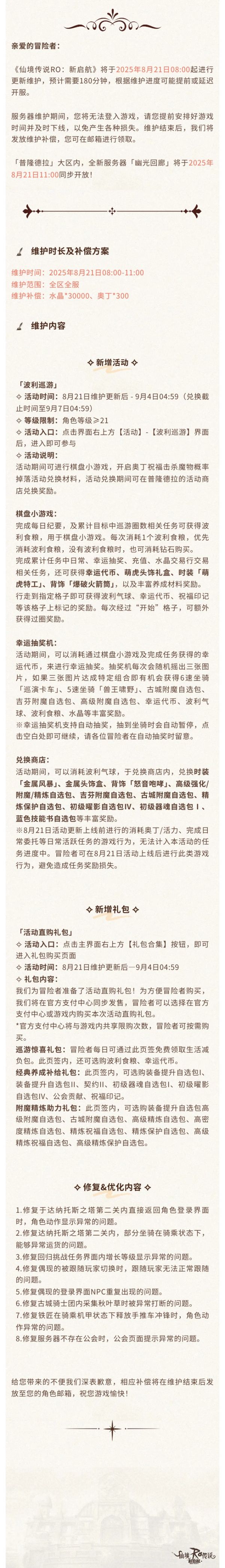 《仙境传说RO:新启航》将于2025年8月21日08:00起进行更新维护,预计需要180分钟,根据维护进度可能提前或延迟开服。