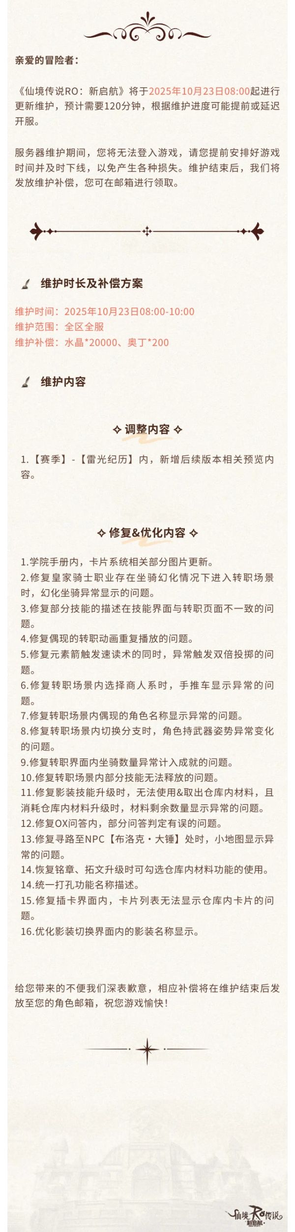 《仙境传说RO:新启航》将于2025年10月23日08:00起进行更新维护,预计需要120分钟,根据维护进度可能提前或延迟开服。