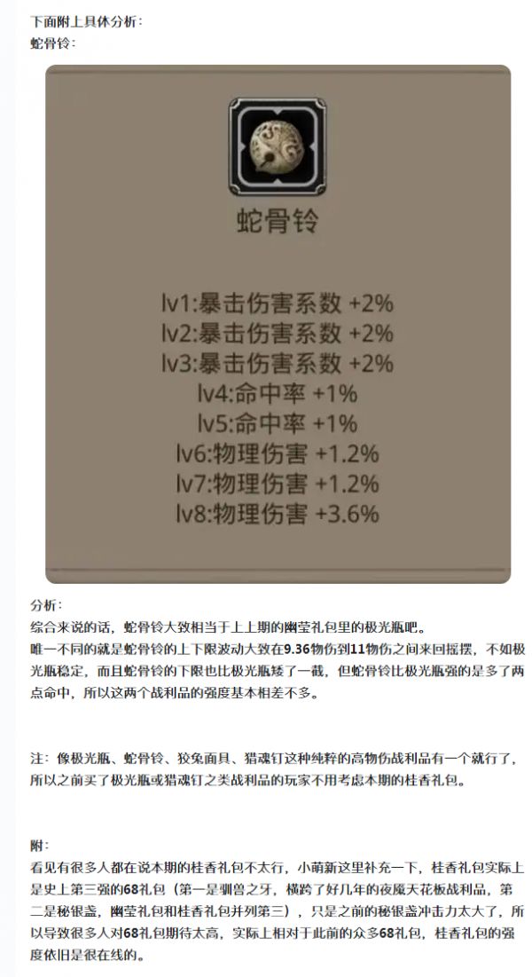 时间:2025-10-23 16:29看见有很多人都在说本期的桂香礼包不太行,这里补充一下,桂香礼包实际上是史上第三强的68礼包(第一是驯兽之牙,横跨了好几年的夜天花板战利品,第二是秘银盏,幽莹礼包和桂香礼包并列第三),只是之前的秘银盏冲击力太大了,所以导致很多人对68礼包期待太高,实际上相对于此前的众多68礼包,桂香礼包的强度依旧是很在线的。