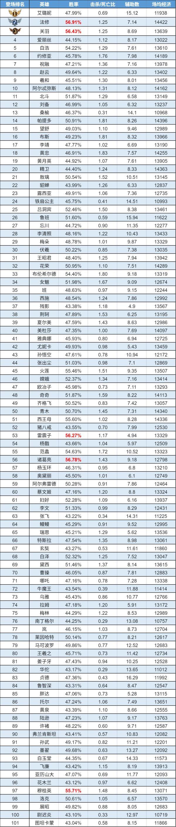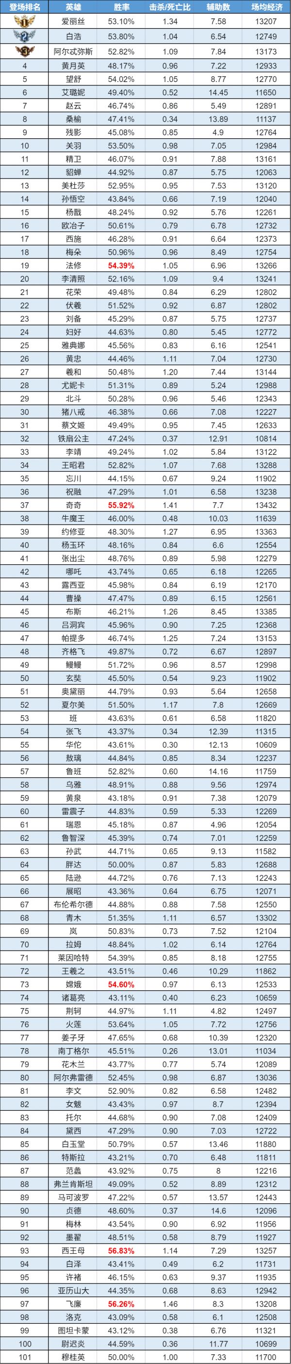 排序:按登场率高低排序,标红为胜率前5