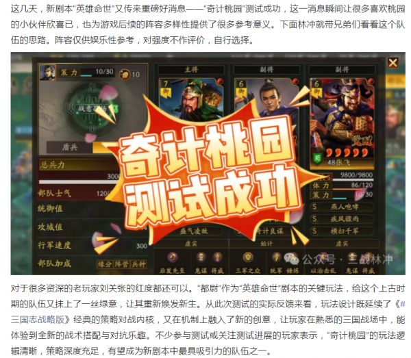【攻略分享】英雄命世“奇计桃园盾”:关羽、张飞、陈翊战法、兵书搭配及实战思路