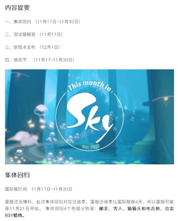 11月果然不平凡,渠道服在渡劫,熬过去就续约,熬不过可能会爆发停服潮。 ?同时,集体回归时间确定了也在11月, 这下有得肝了。 ?还有测试服解禁和新版本,消息来自光遇TGC官方公告。