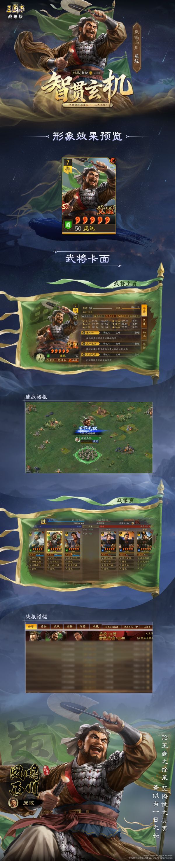 11月11日10点起,形象商店新增“智贯玄机”主题精品形象:「庙算潜谋·贾诩」、「凤鸣西川·庞统」。主公届时可点击【形】字入口查看商店。消耗988金饼即可获取对应一款武将的形象。解锁该形象不会获得属性点。