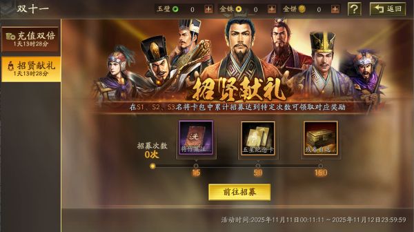 活动期间,主公可在游戏内活动界面中充值获得双倍玉璧,各档位玉璧均可充值一次。本活动内充值获得的玉璧与游戏内充值界面内的首充赠送玉璧互不影响。